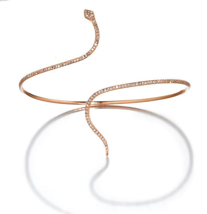 Serpent bangle in 14K rose gold with micropavé diamonds from head to tail (front side only).